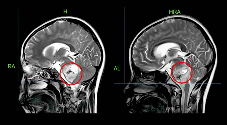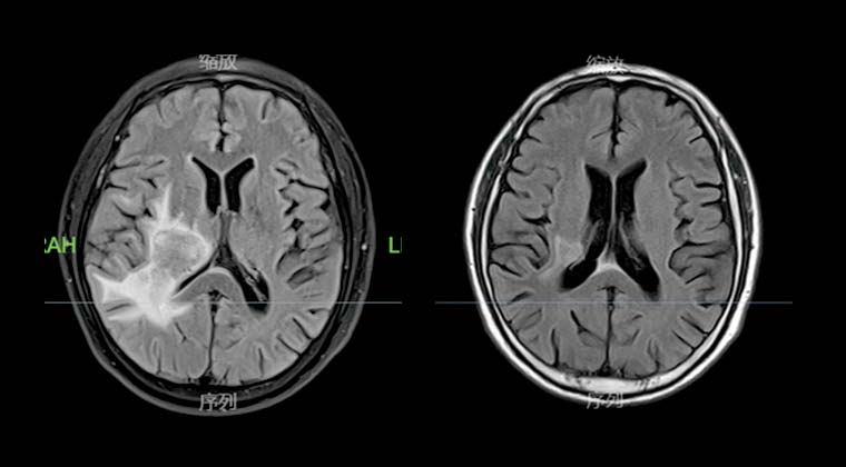 Через 2 месяца после лечения контрольная визуализация показала небольшое уменьшение очага опухоли ствола мозга. Сознание восстановлено, речь значительно улучшилась, движения конечностей постепенно нормализовались.