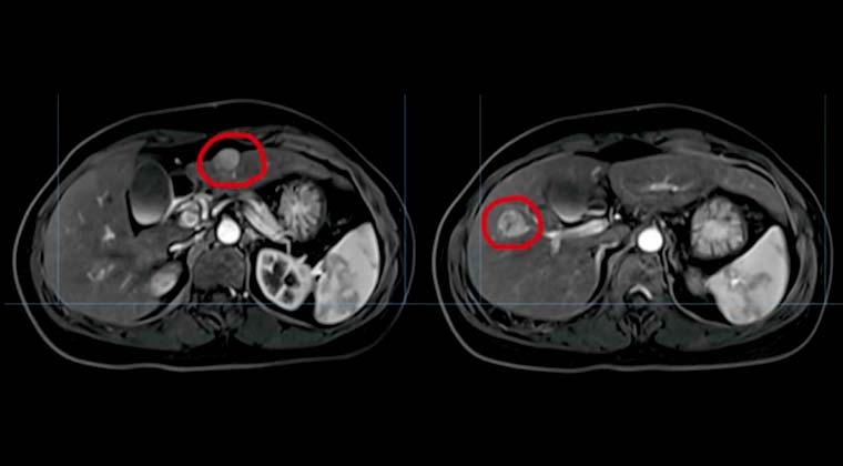 Изменения после комплексного лечения рака печени; очаги значительно уменьшились по сравнению с предыдущим обследованием.
