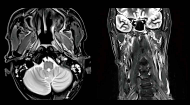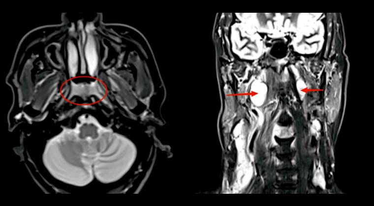 Через восемь месяцев после лечения контрольная МРТ показала уменьшение опухоли носоглотки и лимфатических узлов с положительным диагнозом, регресс утолщения слизистой носоглотки.