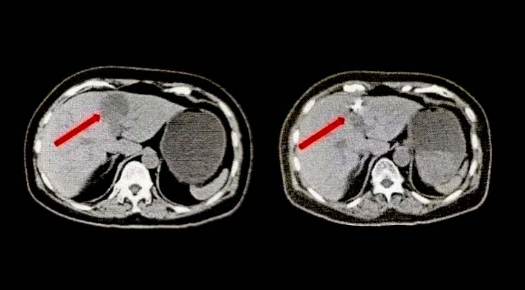 Правая картинка: Через месяц после лечения, контрольная КТ (очаги опухоли явно исчезли)