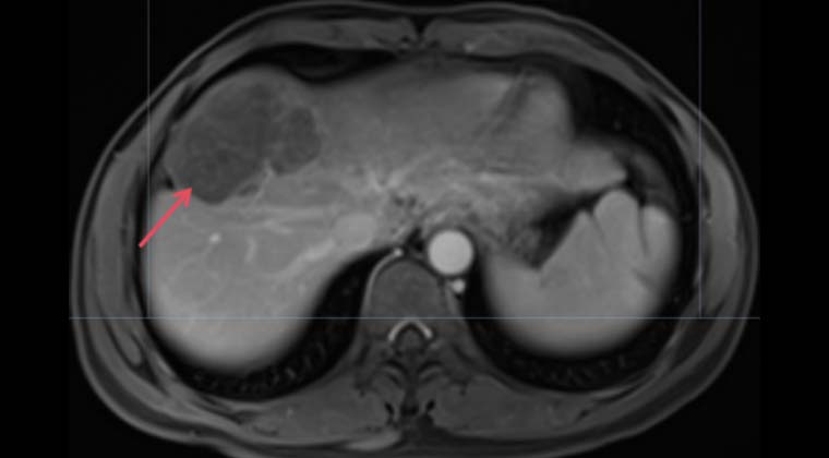 Пациент, мужчина, 75 лет, умеренно дифференцированная аденокарцинома поперечной ободочной кишки, с метастазами в печень и кости.