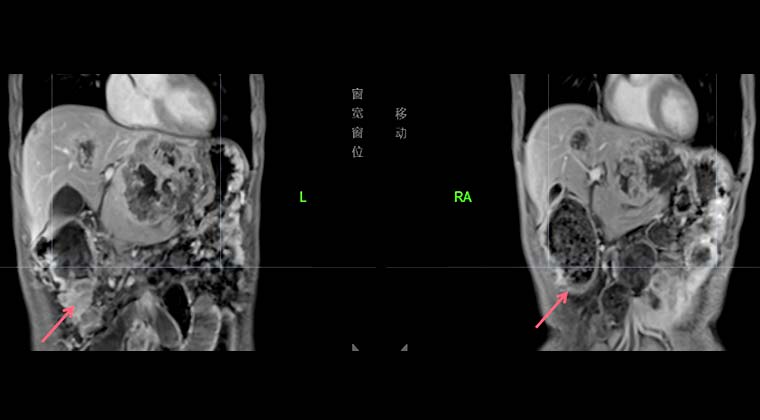 Правое изображение: 2024-10-14, опухоль поперечной ободочной кишки значительно уменьшилась, анемия пациента заметно улучшилась