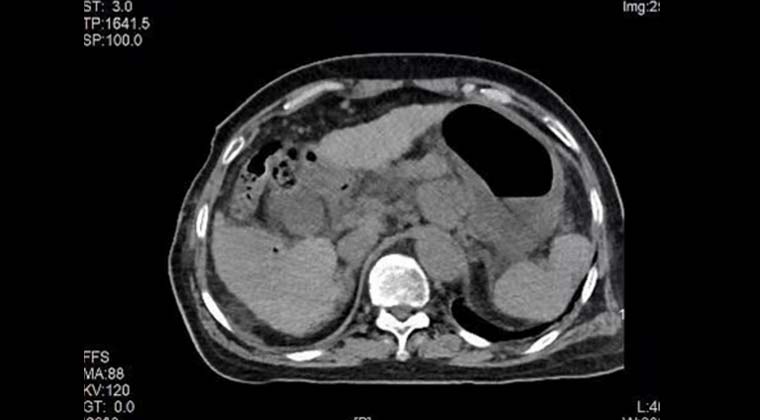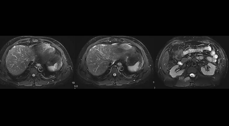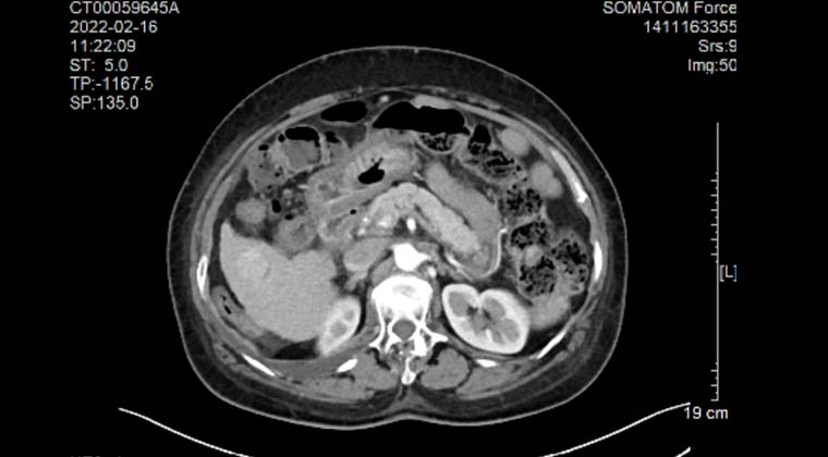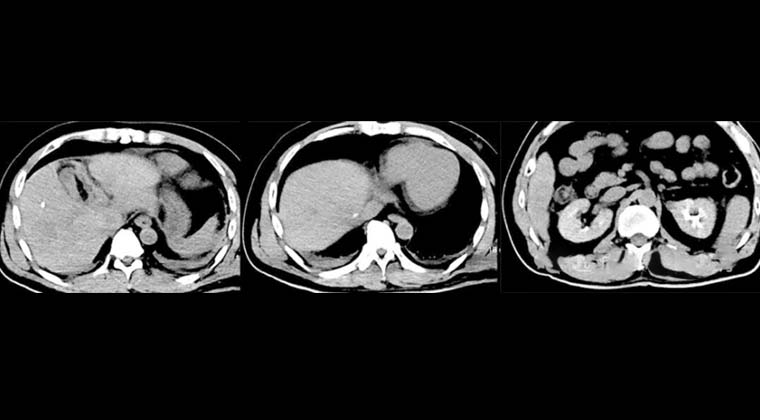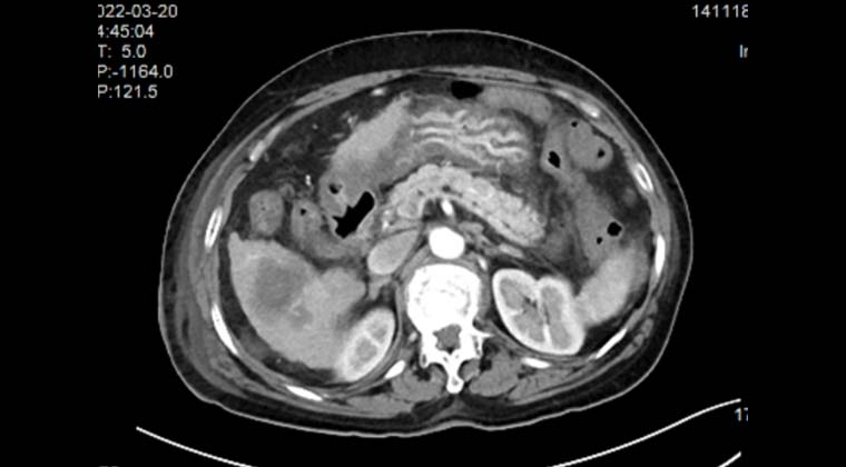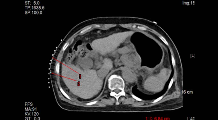 Пациент: женщина, 70 лет, злокачественная солидная опухоль печени, очаг расположен рядом с кишечником.