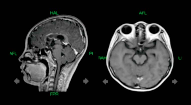 Контрольная визуализация через 10 месяцев показала значительное уменьшение опухолевых очагов в супраселлярной и шишковидной областях по сравнению с предыдущими исследованиями