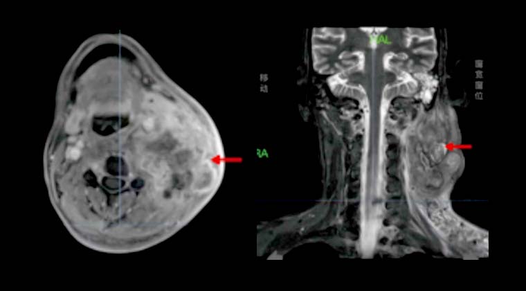 Через 3 месяца после лечения при визуализации отмечалось значительное уменьшение размеров и числа множественных метастазов в шейных лимфоузлах.