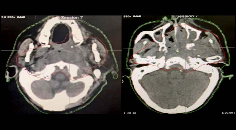 После 7 сеансов лучевой терапии опухоль значительно уменьшилась (на изображении область опухоли обозначена красной сплошной линией), головная боль облегчилась. У пациентки повысилась уверенность в лечении. План лучевой терапии был скорректирован для облучения шейной зоны лимфатического дренажа, и в итоге локальная опухоль получила суммарную радикальную дозу 70 Гр.