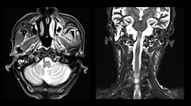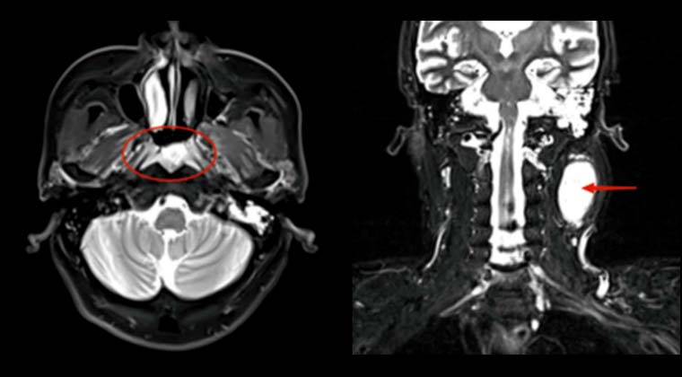 Диагноз «рак носоглотки» был поставлен 5 лет назад; стандартная химиолучевая терапия не проводилась, лечение осуществлялось самостоятельно. Месяц назад головные боли стали прогрессирующими и невыносимыми, сопровождались опущением левого века и снижением слуха.