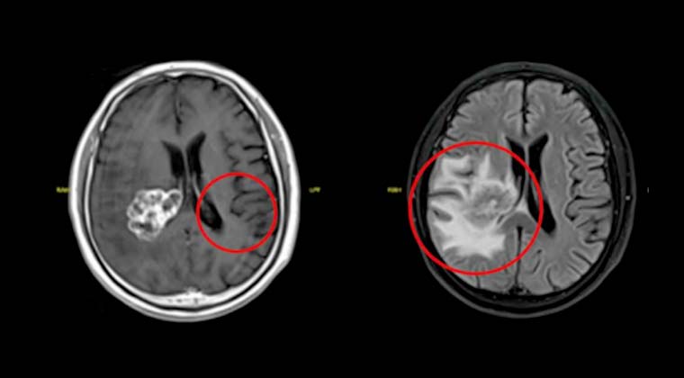 До лечения: выраженный отёк вокруг опухоли и повышенное внутричерепное давление